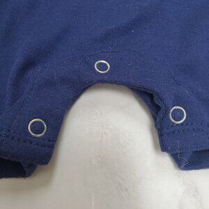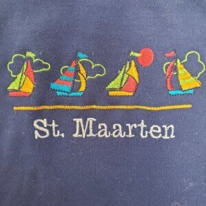This one-piece romper is absolutely adorable and ready for Spring or Summer! It features a navy blue stretch jersey knit with embroidering across the front that feature St. Maarten sailboats.
