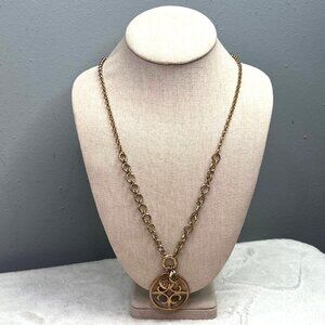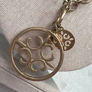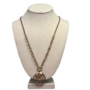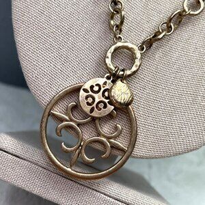 St Magnus Cross Celtic pendant necklace in gold tone. Has 2 dangle charms along with the pendant, lobster clasp closure and chunky chain. Some discoloring from age but good condition otherwise. Measures approx 32" long.