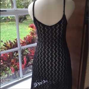 This cute mini dress is black with a gold weave. Great for a night out! It’s not too short, but the perfect flattering length. Made in U.K. EUC
