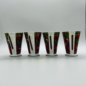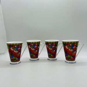 Brighten your dining experience with this set of four strawberry patterned mugs. Featuring vibrant red, blue and green colors, these mugs add a cheerful touch to any table setting.