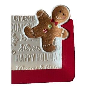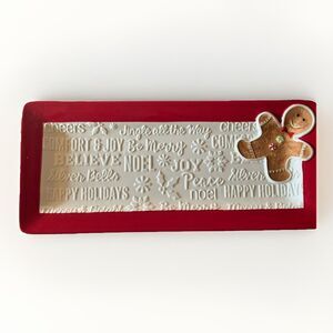 The image shows a red and white decorative tray with a gingerbread man figure on the right side. The tray is inscribed with various holiday-themed words and phrases, including "Cheers," "Jingle all the Way," "Comfort & Joy," "Be Merry," "Believe," "Noel," "Joy," "Silver Bells," "Happy Holidays," "Peace," and "Merry & Bright." These words are arranged in a pattern across the white part of the tray, with snowflake designs interspersed among them. The gingerbread man is brown with white icing details and colorful candy accents. The tray itself has a red border and a rectangular shape.