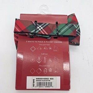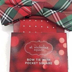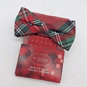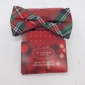 St. Nicholas Square Christmas Green & Red Plaid Bow Tie & Red Polka Dot Pocket Square. NWT Great for the Holidays, Cosplay Costumes, etc. Adjustable Tie clips on.