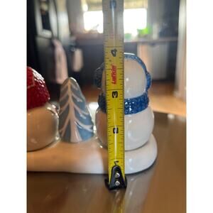 St Nicholas Square Let It Snow Snowman Salt & Pepper Shakers With Stand GUC 3 PC Set. Tops looks perfect. Bottom of stand has stain. See all images