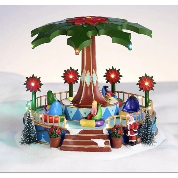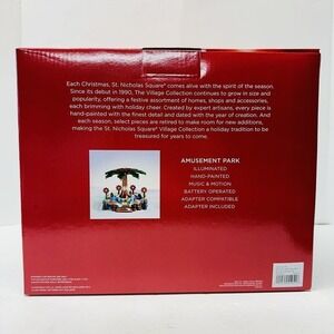 Get into the Christmas spirit with this beautifully crafted St. Nicholas Square Amusement Park Christmas Santa. This hand-painted, snow village themed collectible is perfect for holiday enthusiasts of all ages. With its intricate design, illuminated lights, and musical motion, this item is sure to add a magical touch to your holiday décor.