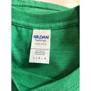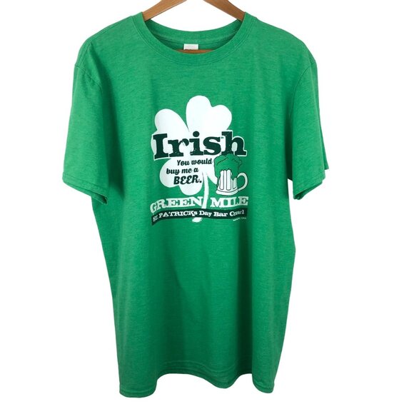 Celebrate St. Patrick's Day in style with this Gildan men's large size green graphic print t-shirt featuring the Green Mile Bar Crawl design.