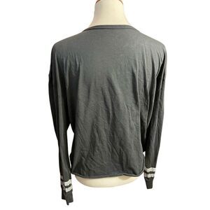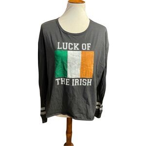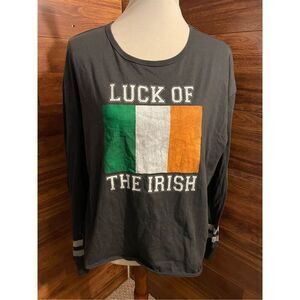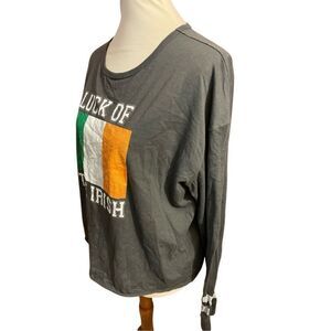 This is a gray long-sleeve shirt by Celebrate, featuring the phrase “Luck of the Irish” in bold white letters across the front. Below the text, the design includes the Irish flag with green, white, and orange vertical stripes. The sleeves have decorative stripes near the cuffs, adding a sporty touch.