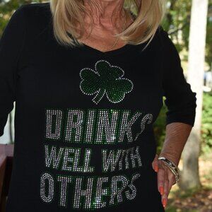 St. Patrick's Day black long sleeve rhinestone bling round neck shirt featuring a uniquely fun Drinks Well With Others St. Patrick's Day design with lots of sparkle. If you like unique bling, this is the shirt for you.