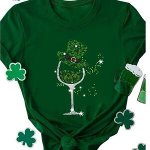 Celebrate St. Patrick's Day with this vibrant dark green tee. Features a sparkling leprechaun hat and wine glass design.