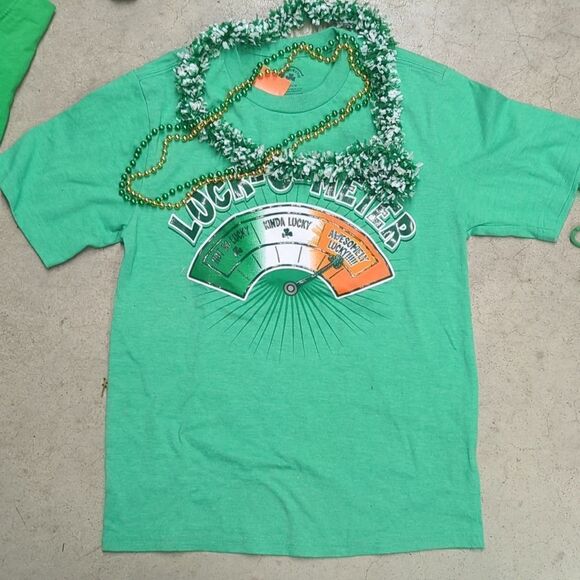 a great t-shirt to celebrate St. Patrick's Day, if you're feeling kind of lucky or awesomely lucky, then this is the t-shirt for you. this is a youth extra large and would also fit an adult small comes with beads and a fun Irish liae