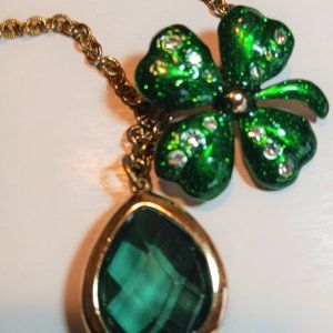 Pendant that has a teardrop emerald type stone that has a shamrock with rhinestones that can be also used a a brooch. Necklace comes with matching earings and is gift boxed.