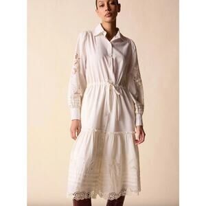 St. Roche Midi Shirt Dress White Cotton Collared Puff Sleeve Tiered Sz 6 Cottage
