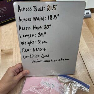 Measurements: Across Bust = 21.5", Across Waist = 18.5", Across Hips = 20", Length = 34".