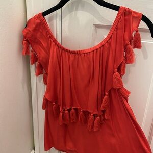 Red silk tasseled blouse. Can be worn off or on the shoulders. Viscose and modal.