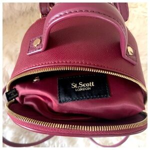 St. Scott London Burgundy Gold Hardware Mini Backpack Shoulder Bag. Zipper closure. Faux leather. Front pocket with zipper closure. Adjustable straps. Inner zip pocket. Contrasting gold hardware and logo to front of bag.