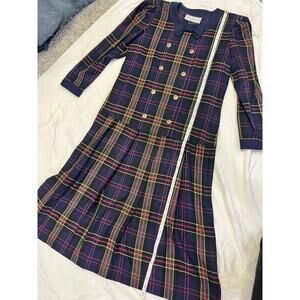 Beautiful navy tartan plaid midi dress, such a cool 1980’s vintage vibe! Very good condition besides a little wear on the inner collar. No garment care or materials tag but it feels like a cotton/poly blend. No size tag but measurements fit a loose fitting small. Please see photos. Functional buttons make it nursing/pumping friendly. 1980’s preppy vintage dark academia academic