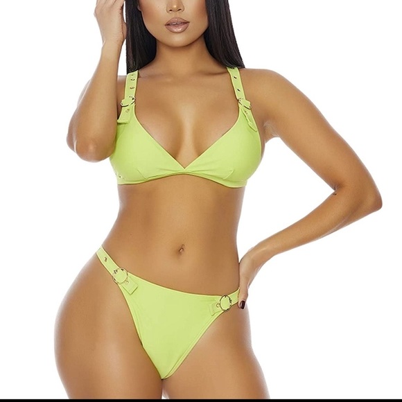 2pc. Bikini set with triangle top with adjustable grommet buckle straps and matching bottoms.
