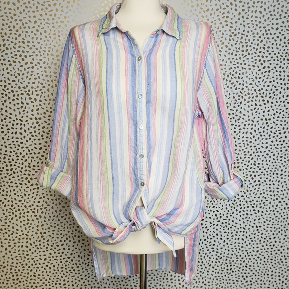St Tropez West 100% Linen multi colored striped button down. Long tunic length blouse. Can be worn tied or not. Tabs to hold rolled sleeves. Excellent Condition! Fast Shipper!! Flat lay measurements: Chest: 20" Length: 34" Same or Next Day Shipping!