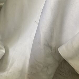 * It needs a professional cleaning, especially along the long train and hemline. There are no permanent stains, just needs a refresh with dry cleaning.