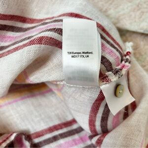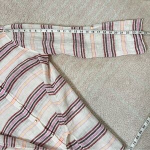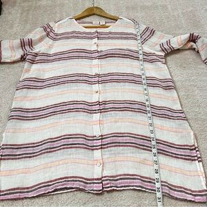 Stylish button-down tunic blouse with pink, red, maroon, orange, and cream stripes. Perfect for casual outings.