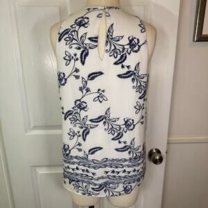 resortwear, sleeveless blouse, floral print, navy white, tank top, keyhole back, round neck, border print hem, lightweight, summer top, size small.