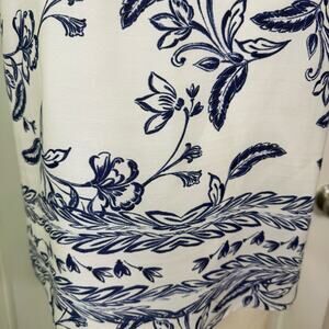 Description: Chic St. Tropez West sleeveless blouse in a crisp navy white botanical floral print with a pretty border print hem. Lightweight woven shell with round neck and back keyhole back detail; hits at hip for easy layering. Versatile tank top works as a polished summer top for work-to-weekend outfits. Women’s size small; true to size. Style for office, resort, and casual looks; pairs perfectly with denim, shorts, or trousers.
