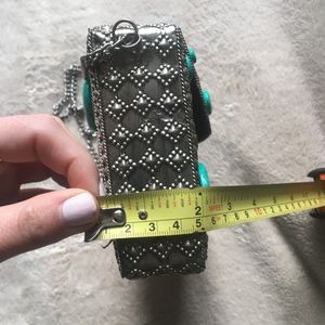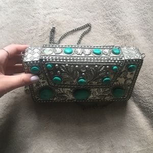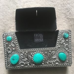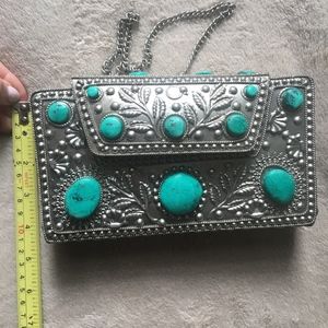 St. Xavier "Esi" crossbody bag. (Commonly sold at Free People or Revolve) In silver metal and turquoise. Extremely beautiful and special bag in great condition! ** 1 missing stone on back (3rd image) and 1 missing stone along top of bag (4th image)**