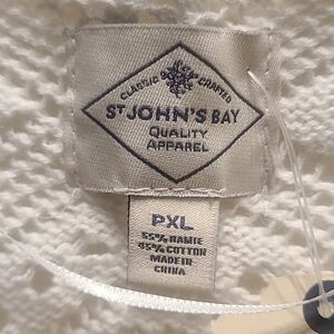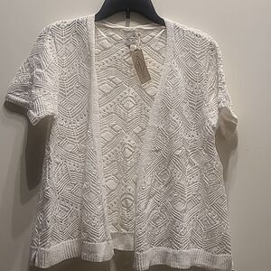 short sleeve knit sweater... flow front blousing. side slits for relaxed wear reinforce waistband and arm caps no damage or snags pet and smoke-free facility