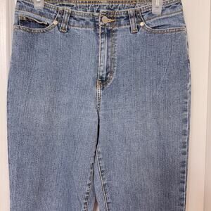 These jeans do not have any labels to it. It says St. John's Bay on the button in the front. Measurements across the waist are about 14 1/2 inches top to bottom is about 37 inches in the inseam is about 26 1/2 inchesand the rise is about 10 inches. On the front legs from the knee down it does have that white mark on both legs I'm not sure if that's how the jeans are or if they were just extra ironed. Please see pictures carefully.