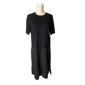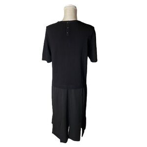 St. John Boutiques Black Knit Drop Waist Casual Dress. Features knit top with short sleeves and button back neck closure. Top is the famous Santana Knit with drop waist with contrast material presented as monochromatic black skirt. Simple, chic and easily dressed up or down; closet staple dress. Rayon/polyester blend. Measurements in pictures.