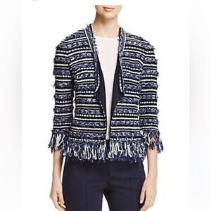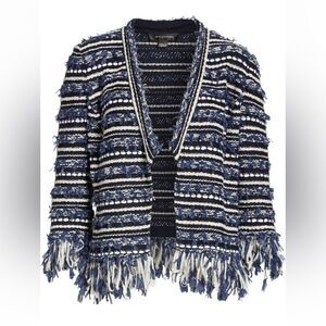 Size S. Rare and sold out everywhere. Hand-looped fringe enriches the tactile dimension of an open-front jacket striped with a textural mix of lofty yarns and floating stitches.