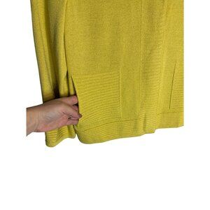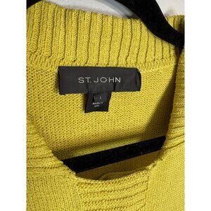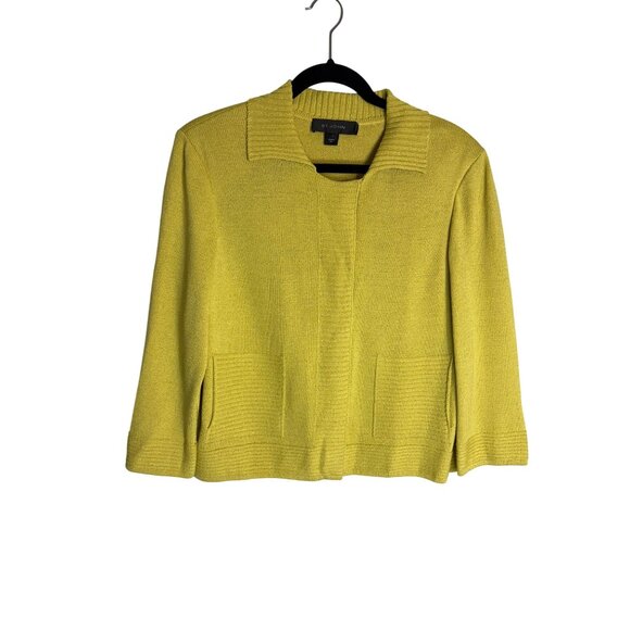 Excellent condition, no flaws, size large. St. John Collection Santana Knit Sweater Blazer Yellow. A light chartreuse/alfalfa-green (yellow-green) knit. With button front closure with a rib-knit collar and ribbed trim at pockets and hem. Boxy silhouette, long sleeves, pockets at front.