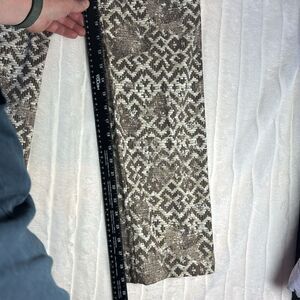 Stylish geometric woven print pants featuring a unique brown, tan and white pattern. Perfect for casual occasions and dog shows. In very good pre-owned condition. Normal wear and tear noted, but no flaws or damage. Please review pictures and feel free to ask any questions or for more pictures prior to purchasing.