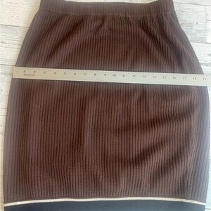 Brown with black and cream line at hem, pull on, no material tag, possible wool blend,ribbed pattern, colors may vary due to lighting, good used condition, 8