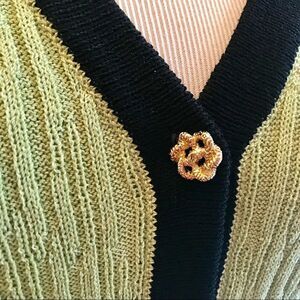 St. John Collection by Marie Gray cardigan in green and outlined in black, gold tone buttons and overall stretch. Bust 38”, sleeve 23” and length 27”.