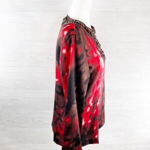 St. John Tie dye top size small. Red/black/white tie dye silk/spandex blend with some stretch. Beaded neckline with v-neck collar. No holes or stains.