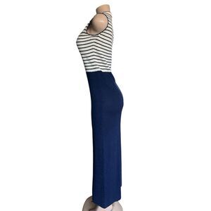 Elegant navy blue and cream maxi dress with a stylish button-down front. Perfect for any occasion.
