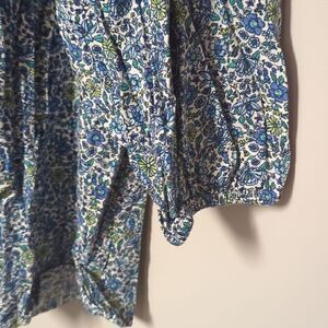 Blue, white and green floral print long sleeve blouse. Elastic bands on the wrists. V Neck into a button down.