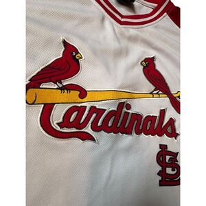 The St. Louis Cardinals MLB Baseball Jersey 2XL showcases a classic design with its white body and red sleeves, featuring the iconic Cardinals logo. It offers a comfortable fit, ideal for avid baseball fans or collectors. The jersey's lightweight material ensures breathability and ease of movement.