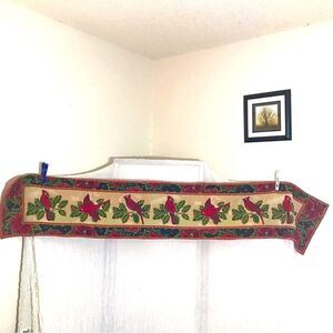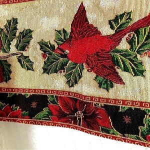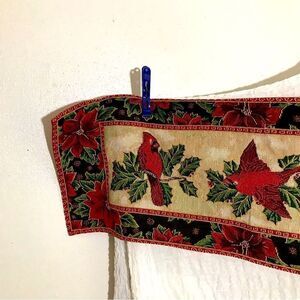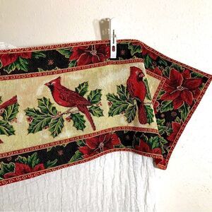 Beautiful Cardinal birds Christmas tapestry table runner. Cotton blend. Machine wash. Great accent piece. Pre-owned in good condition. Please refer to pictures for best description and condition verification.
