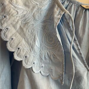This chic sky blue blouse features a delicate eyelet collar, adding a touch of elegance to your wardrobe. Perfect for both casual and formal settings.