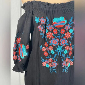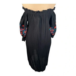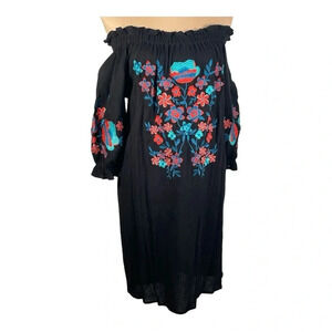 Staccato BoHo‎ Dress Small Black Tunic Shirred Neck Floral Print 🆕