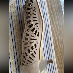 Staccato Kitten Heels Suede Sand Slip On Cutout Rhinestone Womens Sz 38 US 7.5