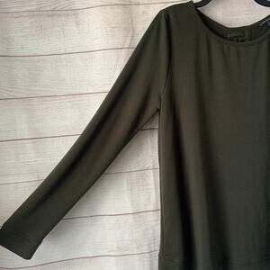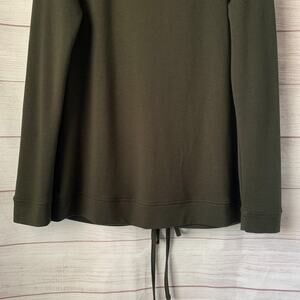 Olive green shirt with a lace-up back by Staccato. This shirt has a rounded neckline, long sleeves, and a grommeted lace up tie string back. It is pre-owned and in great condition.