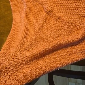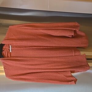 Rose orange knit sweater by Staccato. Ideal for cozy wear. Dolman sleeves, open front, gathered back collar. Way cuter on than on the hanger. Generous size S. Great layering piece for Fall.