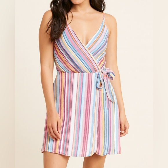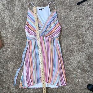 Staccato dress faux wrap mini rainbow striped fit flare side tie summer SZ LG