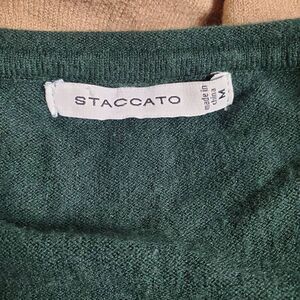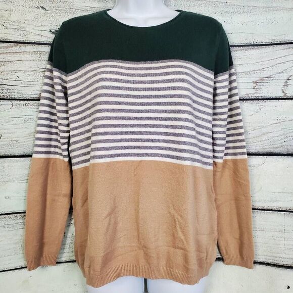 Comfy and stylish Staccato women's sweater in size Medium. Features a crew neckline with colorblock styling: forest green top, gray/white striped midsection, and tan bottom. Lightweight knit, perfect for layering.
