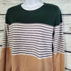 Staccato Sweater M Green Tan Stripe Pullover Lightweight Soft Casual Knit