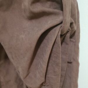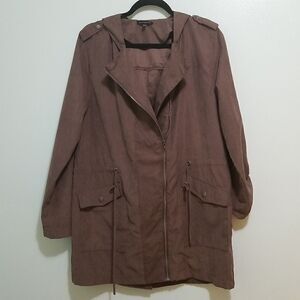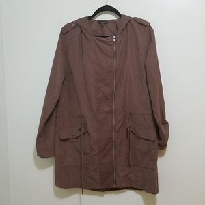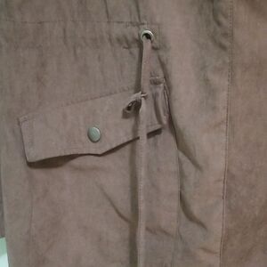 Shoulder to shoulder is 17 inches, armpit to armpit measures 21 inches and the length is 32.5 inches. Poly/nylon blend. Like new condition. Open to reasonable offers.