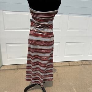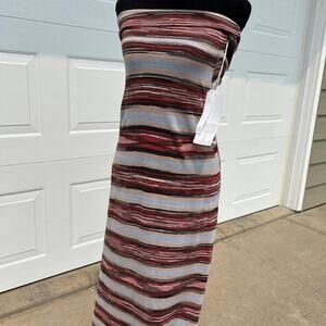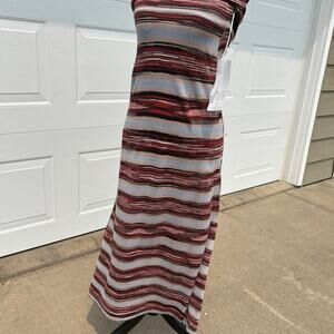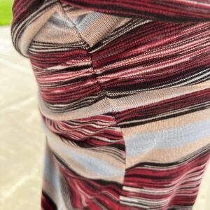 Stacia women’s size S dress . Bamboo cotton blend. Sheered on sides of bust. Horizontal stripes colors of mauve, black tan, and blue.. very stretchy.