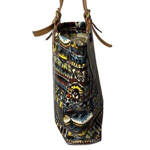 • Secure zip closure • Inner pockets for organization • Durable brown handles • Vibrant multicolor pattern • Spacious interior